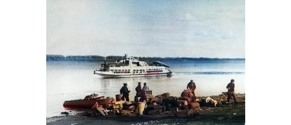 На нем «на носу» на палубе складывалось наше снаряжение, крепилось и накрывалось брезентом на случай дождя и от брызг, а мы располагались на кожаных диванах в пассажирской части, на них и прилечь можно было. Дюральку нашу, лодку моторную на корму затаскивали. На ночь или по какой другой причине он подходил к берегу и просто тыкался носовой частью в землю. Но не на отмели, конечно.