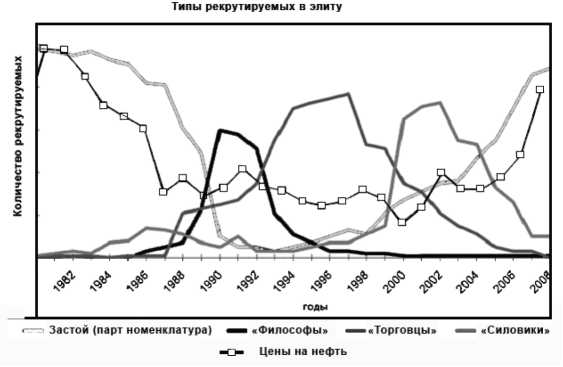 Эта схема показывает связь ротации элит философы-торговцы-воины – партноменклатура с основным экономическим параметром, определяющим существование страны. В нашем случае, к сожалению, это стоимость углеводородов – «нефтяная игла», на которую страну подсадила отказавшаяся от идеалистического проекта ради собственных социально-экономических гарантий советская номенклатура, начиная с середины 60-х годов – период перехода на «социал-империализм» (по терминологии Че Гевары, использованной в «Алжирской речи).