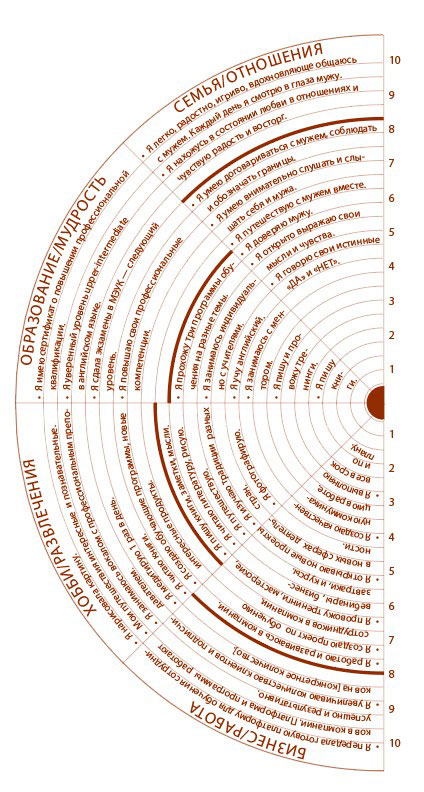 1. Нарисуйте круг и разделите его на сектора. Каждый сектор назовите той областью жизни, в которую хотите внести изменения. Например: здоровье, фигура, творчество, дети, саморазвитие, образование, мудрость, финансы, спорт, семья, отношения, работа, бизнес, хобби, развлечения. Можно назвать сектор желаемой областью, даже если пока она не проявлена в реальности.