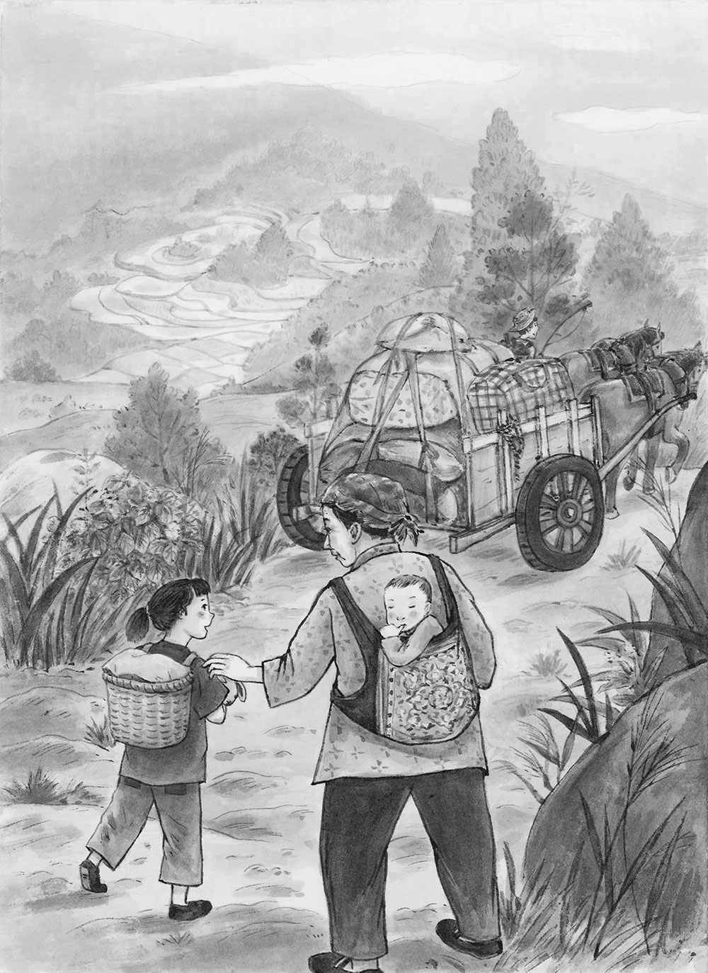 Папины пони тащили все зерновые припасы и вещи семьи из семи человек. Маои то шёл следом за отцом и дедом, что погонял коров, тянувших за собой две тележки с поросятами и курами и одну с домашним скарбом, то подстраивался под семенящий шаг бабушки. Старушка с шестимесячной Сюэр за спиной и с Цзюаньэр за руку замыкала строй – малышка сразу уснула в качающейся холщовой переноске. Вся эта куча домашней утвари, одеял, тюфяков и сетчатых пологов, которая перемещалась с семьёй Маои с одного места на другое, казалась мальчишке настоящей горой Тайшань, сошедшей с места и отправившейся в путь.