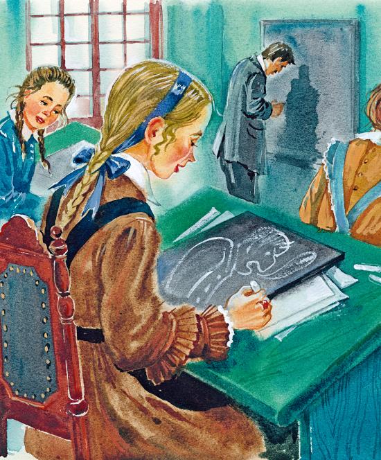 Сёстры прозвали Эми «Маленький Рафаэль»: у неё обнаружился несомненный талант к рисованию, и она никогда не бывала так счастлива, как срисовывая цветы, придумывая разного вида фей или иллюстрируя рассказы и сказки странными образчиками своего искусства. Её учителя жаловались, что вместо решения примеров и задач она покрывала свою аспидную доску изображениями животных, на свободных страницах своего географического атласа она копировала карты, а из её учебников в самые неудачные моменты вылетали трепещущие листочки язвительно-смешных карикатур. Эми удавалось благополучно преодолевать школьную премудрость в меру своих способностей и избегать нареканий благодаря образцовому поведению. Она пользовалась расположением своих соучениц, так как была уравновешенна и, к счастью, владела искусством быть, без особых усилий, приятной со всеми. Её не очень большое важничанье и манерничанье пришлись одноклассницам весьма по вкусу, как и другие её достоинства, ведь, кроме рисования, она умела сыграть на фортепьяно двенадцать мелодий, вязать крючком и читать вслух по-французски без того, чтобы неправильно произносить две трети слов. У Эми была манера жалобным тоном выговаривать: «Когда папа был богат, мы делали то-то…», что звучало очень трогательно, а длинные слова, которые она так любила, девочки считали «совершенно элегантными».