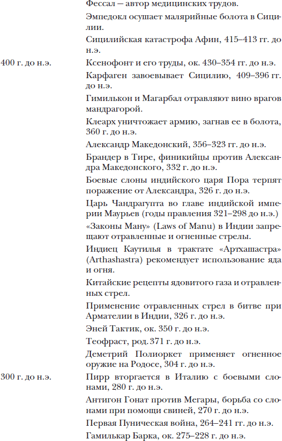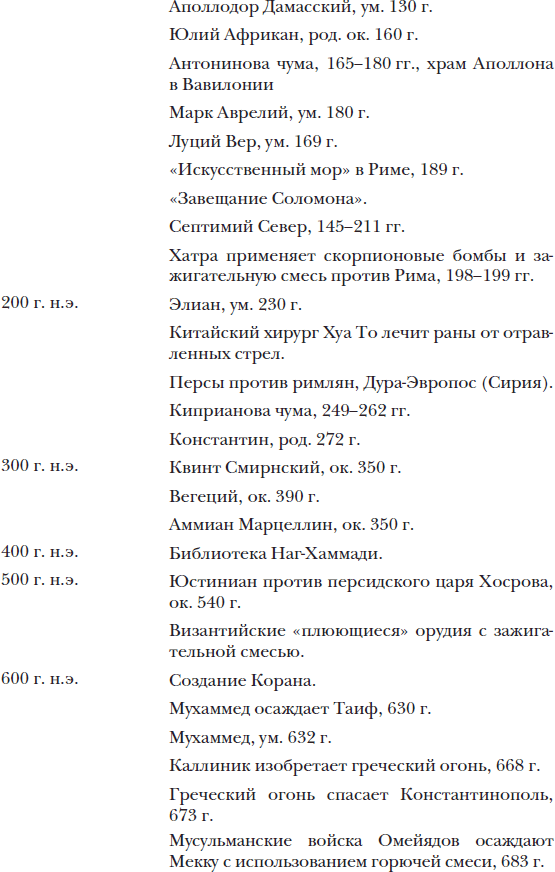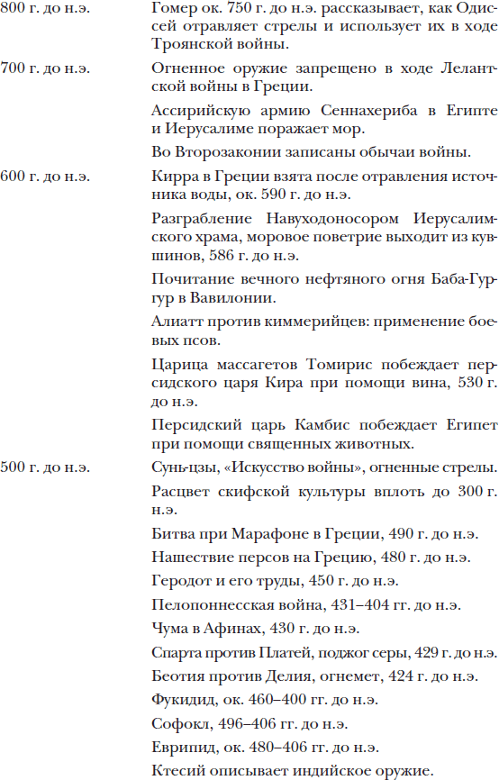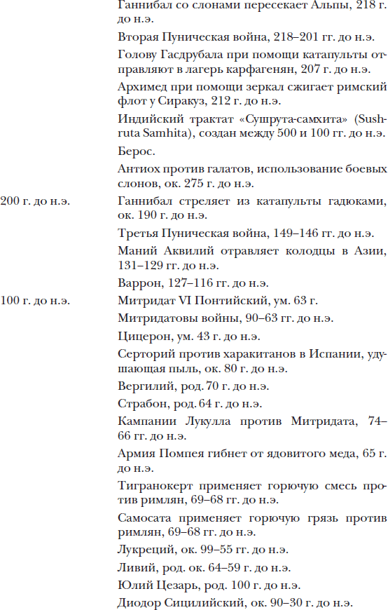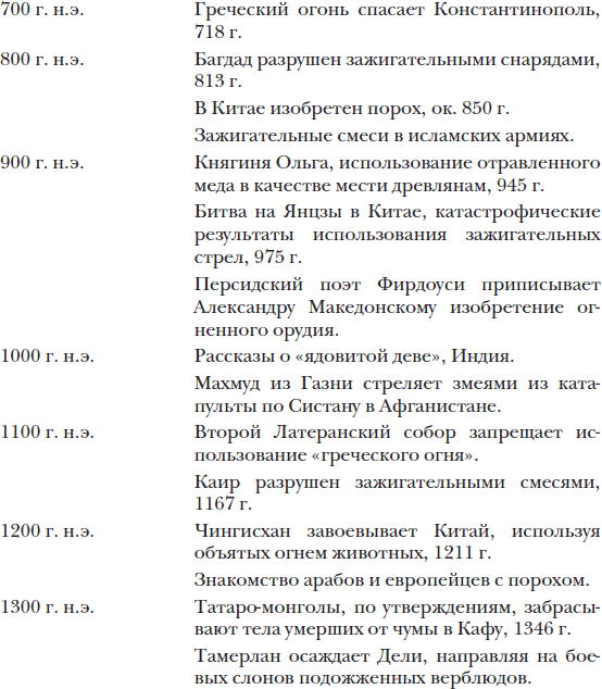 Эта книга не претендует на полноту освещения вопроса, но ставит целью показать глубину и масштабы биологического и химического оружия в Древнем мире. Ее временные рамки охватывают почти 3000 лет, начиная с ближневосточных записей 1500 г. до н. э. и архаических греческих мифов, впервые собранных Гомером примерно в 750–650 гг. до н. э. Начиная с V в. до н. э. до II в. н. э. греческие историки зафиксировали множество примеров биологических и химических методов ведения войны; есть свидетельства и латинских авторов – от основания Рима и до поздней Римской империи VI в. н. э. Тем временем в Китае и Индии о ядовитых и взрывчатых веществах писали в военных и медицинских трактатах начиная с 500 г. до н. э. Далее в данной книге говорится об изобретении греческого огня и других зажигательных смесей, описанных в византийских и исламских источниках VII–XIII вв.