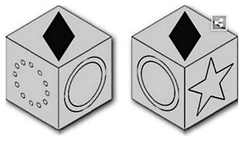 – Еще одна важнейшая грань интеллекта – пространственное, геометрическое воображение, – продолжает Виктор Анатольевич. – Вероятно, поэтому в каждый из тестов Айзенка включено по две задачи на вращение игрального кубика. И в них я нашел ошибки. «Задача 16-го раздела „Примеры“. На каждой грани куба – своя фигура. Мысленно вращая два куба, определите, одинаковые они или разные?»