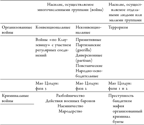 Более масштабно эти сравнения приведены в таблице 1. В нижней ее части представлены способы, при помощи которых преступники и головорезы обретают такую степень организации, что их можно считать участниками войны или близкой к ней ситуации – речь идет о превращении преступников в наемников или о формировании банд под руководством военных баронов. Организованные военные действия в таблице разделены на две группы: конвенциональные (войны «по Клаузевицу», или войны, ведущиеся регулярными соединениями) и неконвенциональные (партизанские или примитивные).