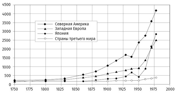 Рисунок 1. Реальный ВНП на душу населения (в долларах США и ценах по состоянию на 1960 год). Источник: Maddison 1983