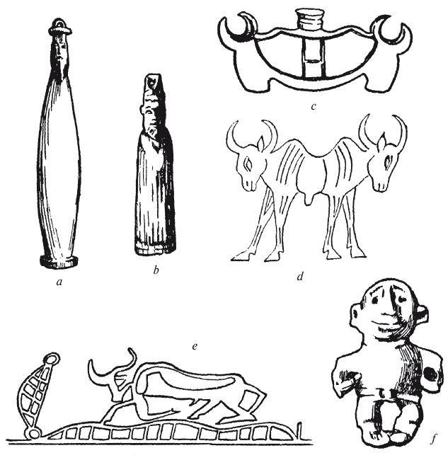 e – неизвестный бог с головой быка; f– карликовое божество