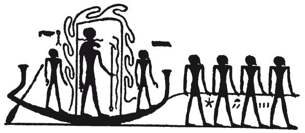 На носу этой солнечной ладьи мы часто находим любопытную деталь, иногда представленную как ковер или подстилка [18], на которой сидит бог, часто дублирующий, таким образом, себя самого, сидящего под навесом. Эта деталь все еще ждет объяснения. Божество может быть или единственным обитателем ладьи, которая движется сама по себе, или он гребет веслами. Иногда его сопровождают множество известных богов, в особенности гелиопольской Великой девятки, и персонификаций мудрости и т. п. В последнем случае на большой ладье, которая в одном тексте [19] описана как имеющая семьсот семьдесят кубитов в длину, гребут веслами многочисленные боги и души царей и других (первоначально особо выдающихся) умерших, «последователей Гора» или «Ра» [20], то есть бога, которому принадлежала ладья солнца. «Книга врат» [21] возвращается к древней идее, объясняя, что «никогда не исчезающие звезды» (то есть избранные души) становятся днем гребцами солнца. Потом солнце может оставаться в каюте, в виде диска, в котором может восседать на троне сам бог, или предстать в виде урея змеи, символа огня.
