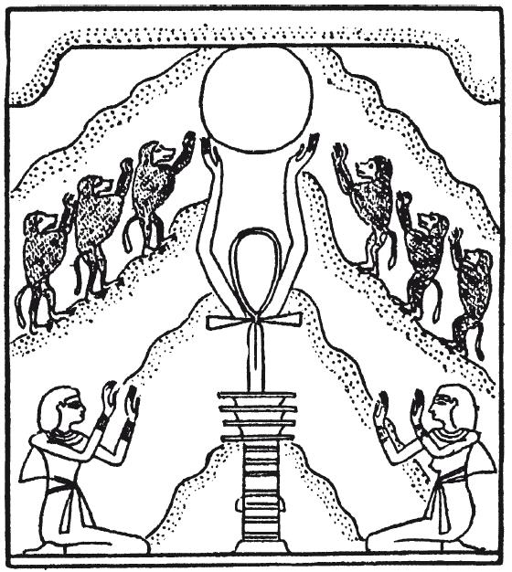 Рис. 14. Павианы, приветствующие утреннее солнце. Солнце поднимается в восточных горах из атрибутов Осириса