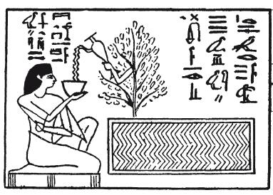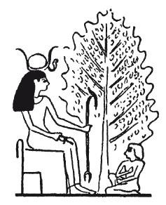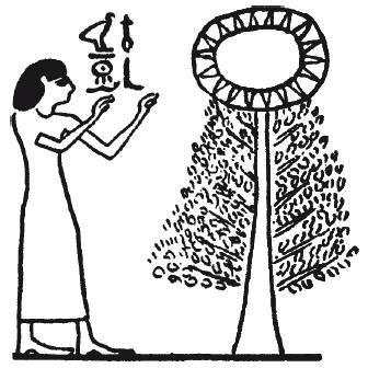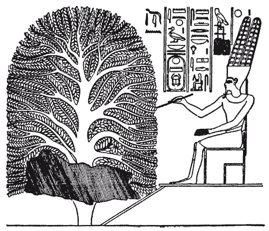Реже его уподобляли финиковой пальме или тамариску. Иногда это была ива, которая растет так близко к воде, что ее можно ассоциировать с Небесным древом, поднявшимся из бездны или из вод Осириса. В связи с мифом об Осирисе, однако, дерево в основном является священным фруктовым деревом (Persea), или (возможно, позднее) благоухающим кедром, произрастающим в отдаленных горах Азии, или виноградной лозой, через плоды которой любовь и смерть вошли в мир. В качестве дерева судьбы оно является священным фруктовым деревом Осириса. Эти сравнения можно отнести к неизбежным попыткам связать удивительное древо на земле с земными деревьями. С развитием идеи его изображали расположенным в части неба. Таким образом, на «великом острове в Полях Жертвоприношения, на котором отдыхают великие боги при никогда не исчезающих звездах», между океаном и небом, между высшим и подземным миром явно расположено древо жизни, которое видят умершие при переходе из одного царства в другое. Как мы уже говорили, наиболее известным из земных воплощений этого древа было священное фруктовое дерево Гелиополя, которое мы видим, например, на прилагаемом рисунке. Но центральное святилище каждого нома имело свое священное дерево, которое, возможно, всегда было призвано символизировать небо. В этих земных двойниках было представлено еще большее число ботанических видов, чем те, о которых мы упомянули.