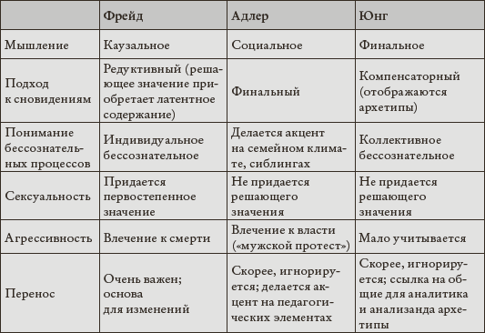 Позднее между Фрейдом и Юнгом возникло соперничество, причем Фрейд, как известно из достоверных источников, в присутствии Юнга дважды терял сознание. Тем самым Фрейд проявил свою неспособность противостоять Юнгу. Но даже если кто-то не согласен с идеями юнговской психологии, уже один объем его трудов и разнообразие обсуждаемых им тем вызывает уважение: психология и патология так называемых оккультных феноменов, диагностика с использованием ассоциаций, психические причины психозов. Интерес Юнга вызывали, прежде всего, архетипы, символы сновидений, психические проблемы современности, реальность души и образы бессознательного. С тех пор влияние К. Г. Юнга в немецкоязычных странах не ослабевает; соответствующие учебные институты находятся в Штутгарте и Цюрихе. В англоязычных странах хорошо известны и Юнг, и Адлер, о чем свидетельствуют многочисленные переводы их работ и издание собрания сочинений Юнга на английском языке. О сходствах и различиях в теориях и методах лечения, присущих классическому психоанализу и аналитической (юнгианской) психологии, прекрасно написал Рольф Фечер (Fetscher, 1978) в книге «Основные направления глубинной психологии З. Фрейда и К. Г. Юнга». Мы приводим схему из этой книги, обобщенно представляющую идеи трех основных школ глубинной психологии.