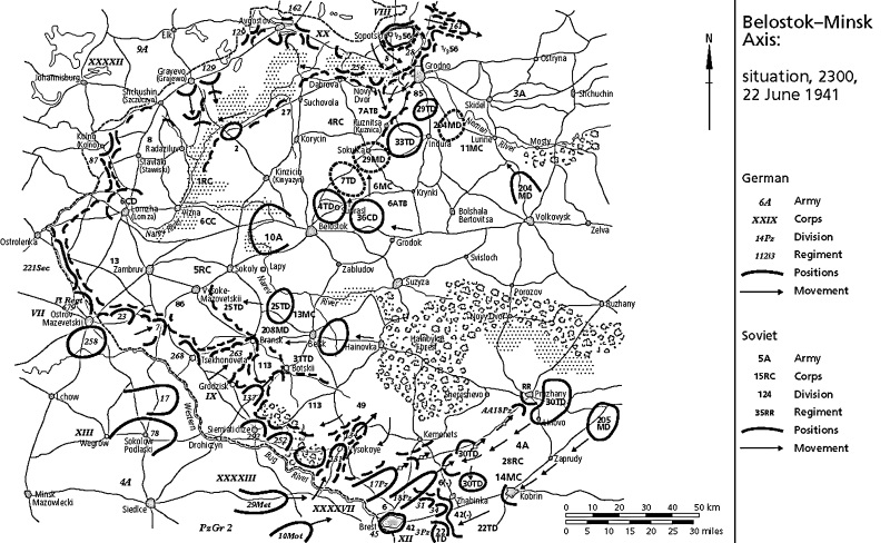 Немцы поначалу полагали, что столкнутся на границе с сильными укреплениями, поэтому Гальдер предложил начать наступление силами пехотных дивизий при максимальной поддержке артиллерии. Но Гудериан 6 июня на совещании в Варшаве категорически отверг это предложение. По его мнению, в России было слишком мало хороших дорог, и он не желал ставить свои танки в хвост медленно движущейся пехоте. Как ни странно, Гудериан оказался прав. Но здесь Вермахт подстерегала другая опасность – подвижные механизированные соединения могли слишком оторваться от пехоты, что затрудняло действия и тех и других. Если во Франции летом 1940 года это не имело серьезного значения, там танки первыми вышли к Ла-Маншу, но Франция закончилась слишком быстро, и потому пехота успела подтянуться. Российские просторы оказались не чета французским, и потому не раз и не два немецкие танковые дивизии оказывались в полной изоляции. Впервые это произошло как раз во время боев в Белоруссии. Однако советские генералы не сумели воспользоваться благоприятными возможностями.