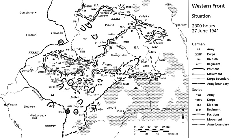 Но в это время гораздо более серьезная ситуация сложилась на реке Щара. Медленно двигавшаяся немецкая пехота оказалась все-таки быстрее советских дивизий, и наступавшая с севера 5-я пехотная дивизия 9-й армии пошла на соединение с 29-й моторизованной дивизией корпуса Лемельсена. Образовался Белостокский котел. Дело в том, что так называемого Минского котла фактически не существовало. В районе Волковысска немецкая пехота 9-й и 4-й армий отрезала части советских 3-й и 10-й армий. Южнее, в районе Беловежской Пущи, в окружение попали еще две пехотные и танковая дивизии. Интересно, что в книге А. Исаева соответствующая карта деликатно отредактирована и из окружения убрана 113-я стрелковая дивизия. Ну и в районе Минска в достаточно неприятном положении оказались 13-я армия и часть сил 4-й армии.