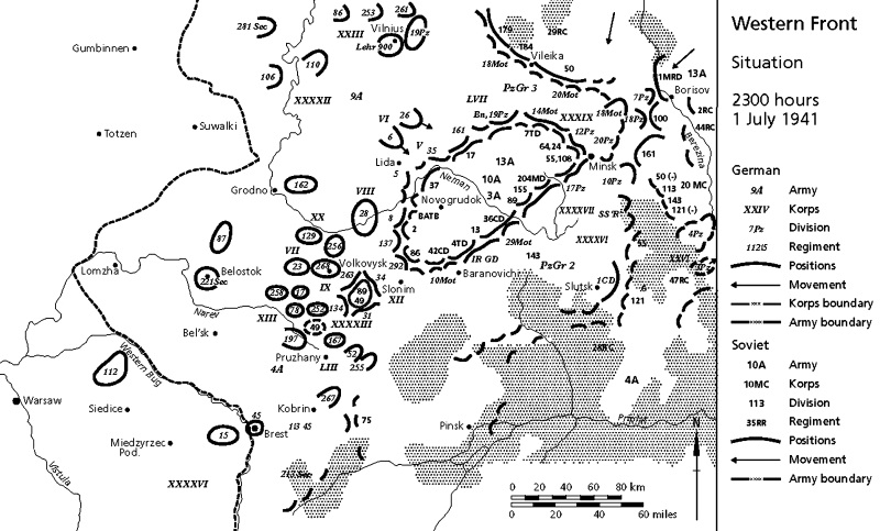 Еще 28 июня 3-я танковая дивизия ввязалась в бои за Бобруйск на берегу Березины, в ходе которых понесла потери. Однако здесь Гудериану снова повезло. Воздушная разведка подсказала командиру 4-й танковой дивизии генералу фон Лангерману нужное направление, и 30 июня она захватила железнодорожный мост в районе деревни Свислочь в 90 километрах южнее дивизии Моделя. Этот огромный разрыв оставался неприкрытым, но советское командование не сумело им воспользоваться. В этот же самый день немецкие саперы наконец навели мосты, и мотопехота Моделя переправилась через Березину возле Бобруйска. Попытки советской авиации разрушить переправы привели к тяжелейшим потерям в бомбардировщиках, действовавших без истребительного прикрытия.