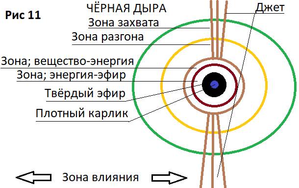 А). Рождение Чёрной Дыры. Чёрные Дыры (Рис 11), как правило, образуются в центре галактик, что свидетельствуют о её зарождении вместе с галактикой. Газопылевое Облако (ГПО), находится в таком разряженном состоянии, что между молекулами газа и частицами пыли всякая связь отсутствует. Но, вещество в облаке, определяет пониженную плотность эфира по отношению к внешнему пространству, что порождает движение вещества к центру облака. Таким образом, где большая плотность вещества ГПО, в это место, постепенно стекается окружающее вещество, при этом может образовать вихревой поток. Пониженная плотность эфира в области вихря, в свою очередь, собирает в себя окружающее вещество, порождая первичное тело, сгусток. Обширные размеры Газопылевого Облака, даёт условия для зарождения множества сгустков вещества, при этом, где большая плотность вещества, там и большая плотность сгустков. Это значит: Самый большой сгусток вещества, образуется в центре газопылевого Облака, образуя плотное, массивное тело. С увеличением массы, за счёт притока окружающего вещества, в центральной зоне тела повышается давление. С повышением давления, в веществе повышается температура, холодный сгусток, переходит в горячую массу. Когда давление и температура вещества, достигает критического уровня, начинается термоядерная реакция, и в космосе, зажигается новая массивная звезда. С увеличением температуры звезды, по той же схеме, увеличивается разница плотности эфира в центре (меньше) и на окраине галактики (больше). По этой причине, чем ближе к центру галактики, тем больше плотность вещества, а к краям, плотность вещества уменьшается. Поэтому, в центральной части галактики, звёзды рождаются быстрее и крупнее, чем на периферии. Практически, по тем же причинам, в Облаке из меньших сгустков, образуются звёзды, вокруг них планеты, с недостаточной массой для звезды. К месту: Звёзды массивными считаются 8-10 солнечных масс. Заметим: Радиус Солнца состовляет-1392000км. Далее: Каждая звезда имеет своё рождение, время жизни и истратив свои ресурсы, смерть. К месту: Маленькая звезда, резко сжимаясь (коллапс) порождает белый карлик. Средняя звезда производит нейтронную звезду. Крупная звезда, порождает Чёрную Дыру. Далее: Центральная массивная звёзда, перегорая, резко уменьшается в размерах (коллапс), сбрасывает часть энергии в пространство, и превращаются в звезду с большой плотностью. По плотности и назовём звезду; «Плотный карлик» (Рис 11). При рождении Плотного карлика, механизм движения вещества к центру Облака, осталось прежним. Поэтому, после резкого коллапса большой звезды, между веществом Облака, и Плотным карликом, образуется «не запланированное» пространство. Пространство, прибавляет падающему веществу на поверхность Плотного карлика, дополнительное расстояние и время для набора скорости (Зона разгона). Вещество, закручиваясь по спирали вокруг Плотного карлика, набрав около световую скорость, переходит в энергию в виде плазмы (ярко светящийся ореол). В зоне вещество-энергия