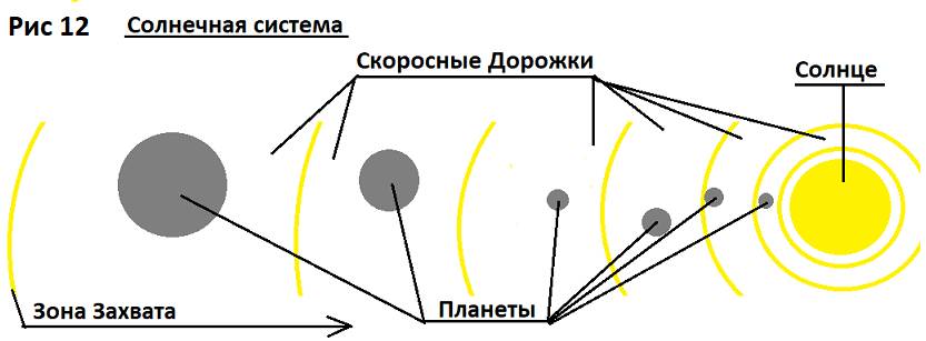 Б). Скоростные дорожки (Рис 12). Для образного сравнения: В Природе есть такое явление: река подмывает высокий берег, когда тяжесть грунта, превышает силу сцепления, кромка берега обрушается. Гранулы эфира, тоже имеют определённую прочность сцепления, что может создать не плавное, течение эфира в звезду, а поэтапный срыв. Например: Звезда, своей энергией размягчая и сжигая эфир, создаёт в близлежащей окрестности, отрицательную плотность эфира (подмыв берега). Когда величина пониженной плотности, превышает прочность внешнего эфира, в эфире происходит частичный срыв, и эфир с соответствующей скоростью устремляется в недра звезды. Зона Срыва, своей пониженной плотностью, провоцирует срыв следующей части эфира. Часть эфира, между границами срыва, обозначим как: Скоростные Дорожки (СД). Границы срыва и Скоростные дорожки, имеют разные размеры, и образуют вокруг звезды расходящиеся круги. Чем массивнее звезда (больше энергии), тем больше число срыва вокруг объекта. Чем больше радиус круга, тем меньше разница в плотности эфира, ниже скорость течения эфира, и больше его плотность. Самая дальняя Граница Срыва, и поверхность звезды, обозначает Зону Захвата. Дальше Зоны Захвата, звезда теряет своё влияние. Далее: Представим себе снежную гору, и лыжника на ней. У самой вершине горы, склон имеет небольшой уклон, и у лыжника на этом участке, небольшая Скорость Скольжения (СС). Через несколько метров, склон слегка увеличивает угол наклона, где у лыжника, увеличивается скорость. Обозначим это явление как: Фактор Принуждения к Движению (ФПД). И так много раз, и на последнем этапе, самый крутой спуск, и самая большая скорость лыжника. Каждый этап спуска (в границах Срывов эфира), является Скоростной Дорожкой, на которых находятся планеты. Планеты, в свою очередь, так же образуют вокруг себя Скоростные Дорожки, на которых могут находиться спутники планет. Скоростные Дорожки, Солнца и Земли, пересекаясь, создают двойные и тройные (Солнце, Земля и Луна) Зоны Захвата (ЗЗ). Пониженная плотность эфира, в двойных и тройных Зонах Захвата, искажают геометрию Границы Срыва. Ярким примером наличие Скоростных Дорожек, является строение колец у Сатурна.