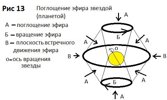 В). Кольца Сатурна имеют вид грампластинки, с полосами вещества (кусочки льда 1см-10м), и полосами пустот (щели). Полосы вещества и пустот, соответствуют плотности вещества с плотностью эфира. Обратим внимание; при диаметре 250000км их толщина не превышает 1,5км. Механизм образования плоских колец вокруг планеты и плоскости планет вокруг звезды, практически один (Рис 13).Итак: Радиус планеты около 60000км, высокая скорость вращения планеты (10,7 час) значительно повышает её энергетику. Мощная энергия Сатурна (температура планеты в центральной зоне более 10000 градусов) планета, порождает высокое поглощение эфира (А). Эфир с двух сторон воронками втягивается в планету (Б). Обе воронки вращаются в одну сторону, поэтому по поясу планеты, возникает встречное движение эфира, двойное течение, (Рис 13 В). Встречное движение эфира, в разы повышает энергию в зоне встречи, и в разы понижает плотность эфира, что создаёт условие притока в эту зону вещества, что и является причиной плоского строения колец (Диск). Здесь уместно вспомнить Закон Бернулли: «С увеличением скорости потока воздуха или жидкости, давление внутри потока уменьшается» действует как в физике энергий, так и в макромире; для жидкостей, и газов. Примеры: Два судна идущих рядом на большой скорости,