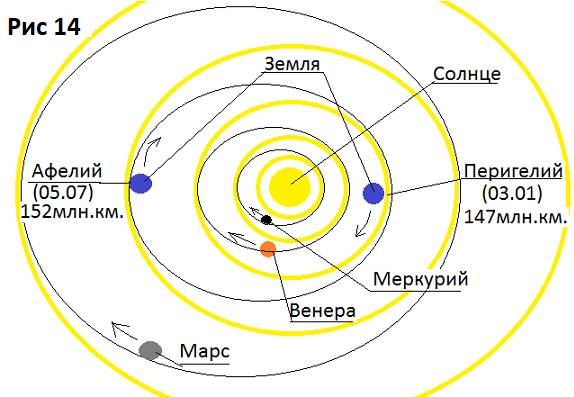 Д). Орбитальное принуждение. Стабильность орбит планет, спутников и комет, объясняется взаимной зависимости скорости (инерции) небесных тел (+ энергетика), и плотности Скоростной Дорожки (Рис. 14). Например, планета Земля: Дальняя точка от Солнца (Афелий) равна 152млн.км. Ближняя точка орбиты равна 147млн.км. Крайние точки Скоростной Дорожки, являются границами оптимального баланса энергии планеты, скорости и плотности эфира, для планеты Земля примерно (5млн.) Масштабное сжигание угля, нефти и газа, уменьшает вес верхнего слоя поверхности планеты, что уменьшает инерционного сопротивление суши, приливным волнам водных масс. Такое