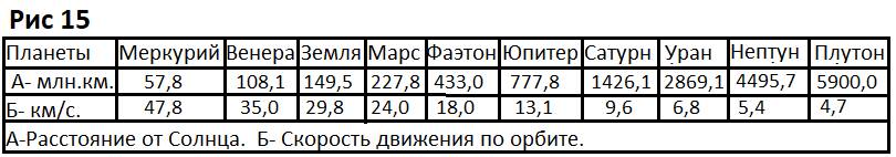 Е). Фаэтон. Вопрос; была планета Фаэтон или нет, не столь важен, как вопрос, что случилось с планетой, если она была?! Второй вопрос касается и нас, землян. Пустое пространство, между Марсом и Юпитером, по своей слишком большой величине, заметно ломает закономерное распределение планет по расстояниям от Солнца. Но, стоит поставить недостающую планету с логичным расчётом расстояния и скорости, и всё становится на свои места (Рис 15). Итак: Солнце, как и все планеты, в том числе и Фаэтон, почти одновременно образовались из газопылевого облака. В состав астероидов, за Марсом, входит вода и обнаружены следы биологической жизни, что может быть частью поверхности планеты. Есть астероид, который может претендовать на часть ядра