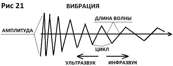 В). Частота вибрации. Определимся с механизмом воздействия вибрационных волн эфира на вещество. Вибрационные волны эфира, как звуковые волны, имеют амплитуду, длину волны и частоту (цикл) за единицу времени (секунда), только значительно превышая значение звука, (Рисунок 21). Тоесть: 1 герц (колебанье) = 1 секунде, в эфире 1секунда, может быть = 1000 циклов (колебаний) и выше. ВЭ, чем плотнее эфир, тем короче длина волны, и выше амплитуда и сильнее мощность волны, и соответственно, при уменьшении плотности, длиннее волна, и ниже амплитуда. Вещество состоит из атомных решёток, соответственно из атомов с ядром (99% массы) и атомным облаком (1% массы). Это значит, на ядро атома, может воздействовать волны вибрации эфира с высокой частотой ВЭ. ВЭ, увеличивают частоту колебания ядер атомов, то есть, прибавляют температуру веществу. ВЭ с низкой частотой воздействуют на облако атомов, воздействуя на атом в целом давлением. Это значит, чем выше частота волны, тем большее воздействие волны на малые тела в качестве температуры. Чем ниже частота волны, тем больше воздействие волны на тела, в качестве давления.