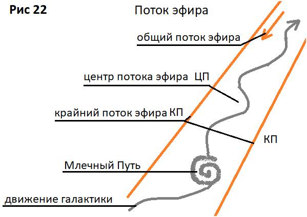 Б). Здесь уместно вспомнить про Потоки эфира, исходящие из Зоны Повышенной Плотности эфира. Предположим: Млечный Путь движется по Потоку Эфира (ПЭ). (Рис 22). В центре потока (ЦП), эфир