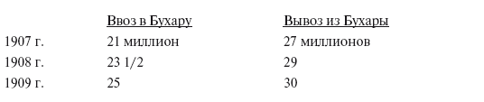Генерал-Губернатор неоднократно в мрачных красках рисует положение дел в Бухаре и говорит о неминуемой общей вспышке в ханстве. Подобные заявления Министерство Иностранных Дел слышит уже свыше 30 лет, и однако предсказания в этом смысле никогда не осуществлялись. Могут ли быть серьезные основания говорить о «полном экономическом крахе» в стране, которая дает следующие статистические данные по ввозной и вывозной торговле за последнее годы: