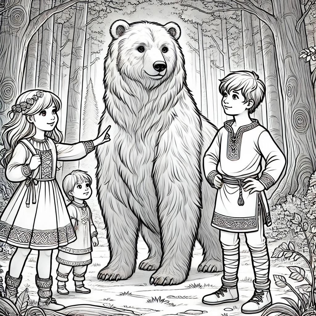 Рядом, опершись на мощную лапу, стоял огромный медведь. Его серебристая шкура мерцала в свете трёх солнц, а глаза сияли, словно ночное небо.