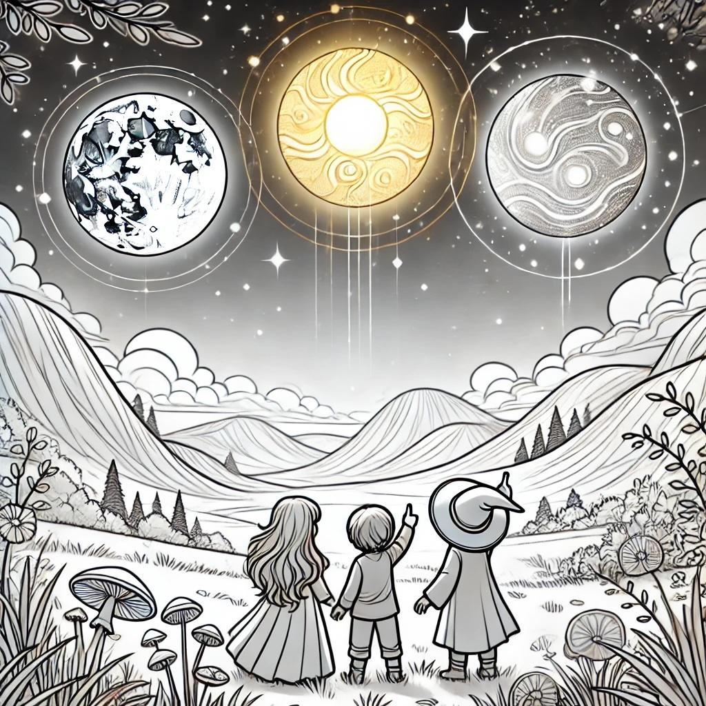 Никита всё это время смотрел на камень, его лицо стало серьёзным. Затем он поднял голову, указывая на небо, где третье, фиолетовое солнце начинало медленно заходить за горизонт.
