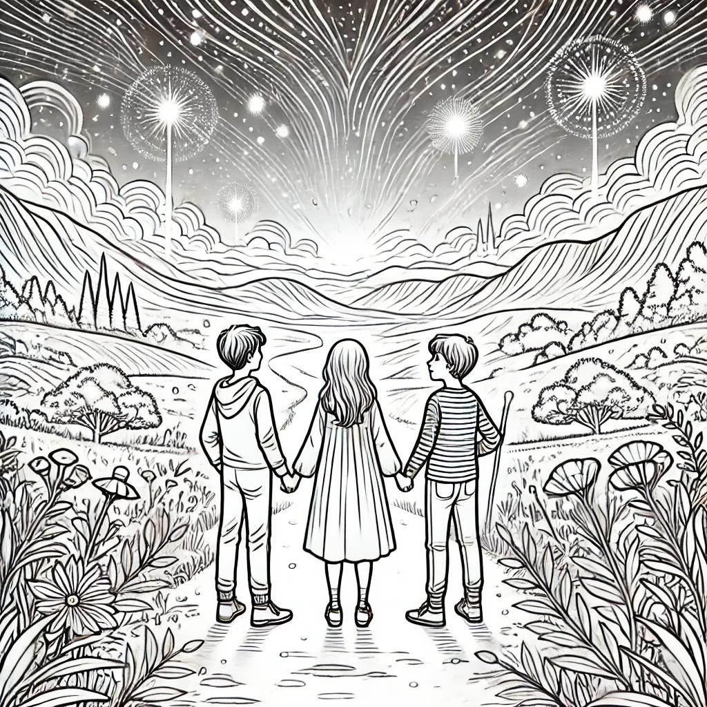 Когда они открыли глаза, всё было иначе. Они стояли на зелёной поляне, трава которой была такой мягкой, будто её ткали из шелка. Воздух пах чем-то сладким, как летний мёд. А вдали виднелись горы, сияющие всеми цветами радуги, словно драгоценные камни.
