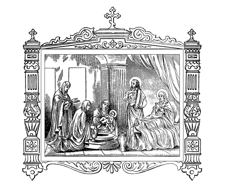 Мария, пробыв у тетки своей три месяца, вернулась в дом свой, а Елисавета вскоре родила сына. Друзья и родственники ее радовались с ней. В восьмой день надо было дать младенцу имя. Все советовали назвать его именем отца; но Елисавета сказала: «Нет, пусть будет он назван Иоанном». – «Но у тебя никого нет в родстве, кто бы назывался этим именем», – говорили сродники и стали спрашивать знаками у Захарии, какое бы имя он желал дать сыну своему. Захария, взяв дощечку, написал на ней: «Иоанн будет имя ему». При этом вдруг возвратилось ему слово; и он стал благословлять Бога и пророчествовать о будущей судьбе младенца, говоря между прочим: «И ты, младенец, назовешься пророком Всевышнего, ибо предыдешь перед лицем Господа приготовить пути Ему; дать уразуметь народу Его спасение во оставление грехов их по благоутробному милосердию Бога нашего, коим посетил нас Восток свыше; осиять сидящих во тьме и тени смертной; направить ноги наши на путь мира». Иоанн назван Предтечей, что значит «предшественник», оттого, что он предшествовал Христу.