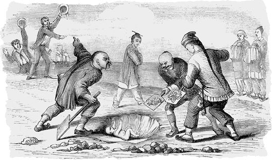 Китайский обычай закапывать живьем нежеланных младенцев. Гравюра, XIX век