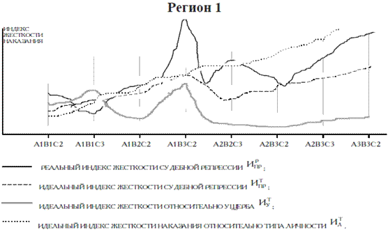 На графиках 1, 2 видно, что идеальный индекс жесткости наказания относительно общественной опасности деяния (итУ) значительно меньше, чем реальный индекс жесткости судебной репрессии (ирПр) В то же время идеальный индекс жесткости наказания относительно типа личности преступника (итЛ) примерно соответствует реальному индексу жесткости судебной репрессии (ирПр). Это значит, что уровень судебной репрессии чаще ориентировался на оценку личности преступника и реже – на оценку общественной опасности содеянного.