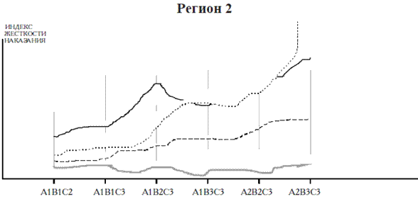 Для иллюстрации обнаруженных закономерностей судебной практики можно рассмотреть два графика, отражающих изменение строгости наказания (индекса жесткости) в зависимости от общественной опасности совершенного деяния и характеристики личности виновного.