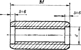 Обычные водопроводные или газовые муфты для соединения штанг нежелательны из-за недостаточных прочности и длины. Для соединения буровых штанг лучше изготовить специальные муфты большей длины, бочкообразной формы и с гладкими концевыми внутренними проточками, в которые концы свинчиваемых штанг должны плотно заходить своими ненарезанными частями (рис. 26). Последнее делается для того, чтобы уменьшить опасные изгибающие нагрузки в концевых сечениях штанг, ослабленных резьбой. Конечно, намного ускоряет процесс соединения-разъединения штанг коническая резьба. Однако сделать такую резьбу очень трудно, и если, что скорее всего, придется ограничиться цилиндрической резьбой, то нарезать ее на штангах надо на токарном станке или клуппом с направляющей втулкой, чтобы избежать перекоса резьбы. Штанги с перекошенной резьбой при свинчивании будут располагаться не соосно, что чревато большими неприятностями, поскольку приводит к вихлянию всей буровой колонны, особенно заметному при ее длине более 10 м.