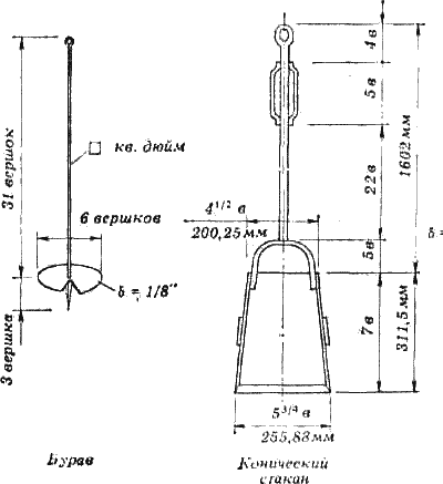 В своей брошюре Е. Е. Скорняков упоминает буровой снаряд Шитца, который «работает чрезвычайно быстро и просто. В течение дня, если работать вдвоем, со всеми приготовлениями, можно легко пробить скважину диаметром 270 мм до 20 м глубиной». Буровой снаряд Шитца состоял всего из четырех несложных инструментов и был доступен для изготовления в любой кузнице (рис. 31).