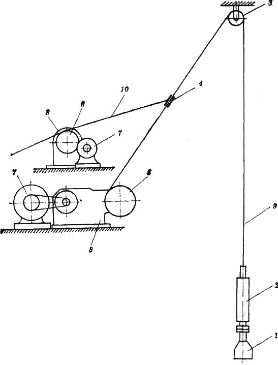 Рис. 35. Схема установки для ударно-канатного бурения: 1 – долото; 2 – ударная штанга; 3 – блок; 4 – подвижный захват; 5 – канатный барабан; 6 – барабан для веревки; 7 – электродвигатель; 8 – редуктор; 9 – канат; 10 – веревка