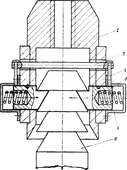При каждом подъеме из забоя бурового инструмента его надо тщательно осматривать. И все же, несмотря на все предосторожности, случаются аварии. Наиболее слабым местом при ударно-канатном бурении является крепление стального троса в канатном замке. При заклинивании инструмента в забое трос иногда можно вырвать из замка. В этом случае для извлечения инструмента придется изготовить ловитель (рис. 36). Перед спуском ловителя в скважину зубья его надо отвести в крайнее положение, сжав пружины и закрепив зубья штифтами. Когда ловитель наденется на верхнюю часть канатного замка – на конусную гребенку, торец замка приподнимет траверсу, штифты освободят зубья, и последние под воздействием пружин захватят замок за конические выступы.