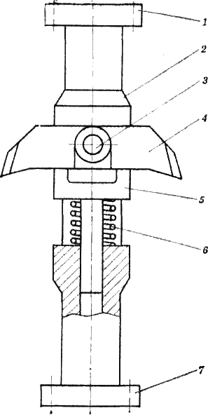 Рис. 37. Расширитель скважины: 1 – верхний фланец; 2 – корпус; 3 – ось; 4 – резец; 5 – подкладка; 6 – пружина; 7 – нижний фланец