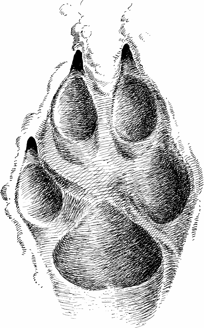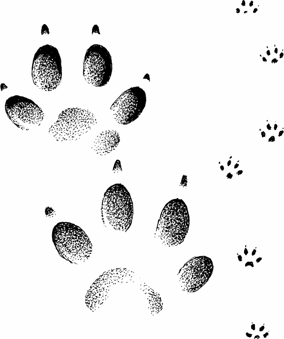 Енотовидная собака. По первым порошам, а среди зимы во время сильных оттепелей встречаются небольшие собачьи следы с отпечатками лап, расположенными не ровной лентой, как у лисы, а в два ряда, по зигзагообразной линии. Округлые отпечатки (с поперечником в 4,5–5 см) на первый взгляд очень похожи на кошачьи, но имеют следы коротких, тупых когтей. Длина шага меньше, чем у лисицы (15–30 см); зверек ходит тяжелее – уже при высоте рыхлого снега в 10 см оставляет «выволоки» и «поволоки», а по более глубокому снегу прокладывает сплошную борозду. Это следы енотовидной собаки (иногда ее ошибочно называют «енот»[14]), ранее водившейся у нас только в Приамурье и в Приморском крае, но в дальнейшем акклиматизированной во многих областях СССР. Бо́льшую часть зимы енотовидная собака, сильно жиреющая осенью, проводит в длительном сне, укрывшись в земляной норе или в логове под буреломом, хворостом, стогом сена. Пробуждаясь время от времени, она оставляет короткий след вблизи логова и снова погружается в дремоту. Отдельные голодные особи деятельны всю зиму и обычно становятся раньше или позже жертвой волков, бродячих собак или подыхают от голода. Енотовидная собака – хищник всеядный, как барсук. Замечено, что летом она разоряет много гнезд уток, куликов, тетеревов и т. п.; жалобы на это поступают из многих мест. Очень интересно подробно изучить по следам жизнь этого хищника в новых областях его обитания.