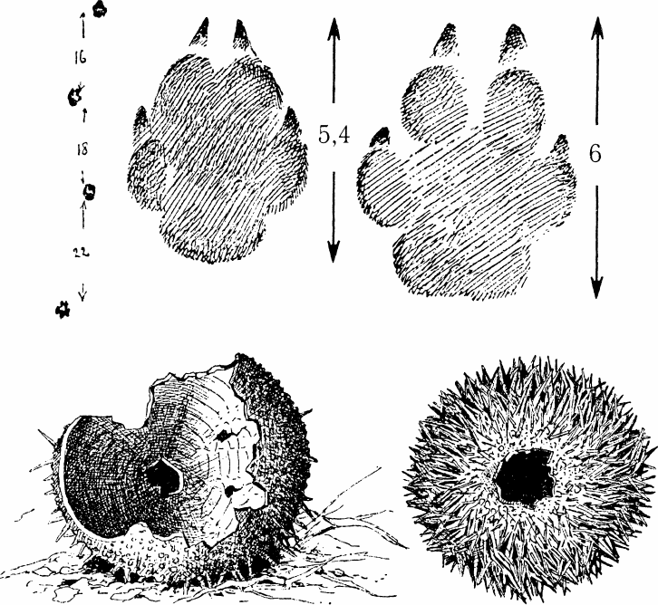 Рис. 10. Следы песца (ум.) и остатки морских ежей: съеденного песцом (слева) и расклеванного серебристой чайкой (справа). О-в Кильдин. Сентябрь 1927 г.