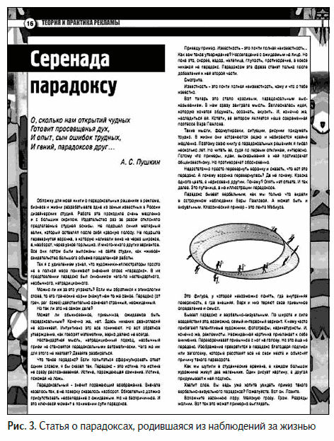 Так я с удивлением узнал, что художники-иллюстраторы просто не вполне понимают значение слова «парадокс». В их представлении парадокс – это синоним чего-то нестандартного, необычного, нетрадиционного. Но так ли это на самом деле? Ответу на этот вопрос я посвятил отдельную небольшую статью «Серенада парадоксу», которая была опубликована в журнале «Новости рекламы» (рис. 3).