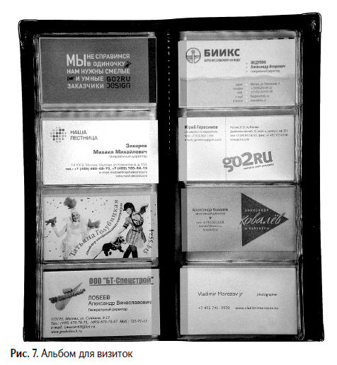 И одним из них является знакомая и привычная для каждого бизнесмена визитная карточка. Совершенно очевидно, что ваши партнеры скорее сотрут электронное письмо, даже если оно будет личным, чем выбросят визитку. Люди имеют привычку хранить визитные карточки. Складывать их в альбомы для визиток (рис. 7).