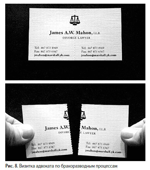 Например, адвокат по бракоразводным процессам может заказать визитку, разделенную по центру вертикальной перфорацией (рис. 8).