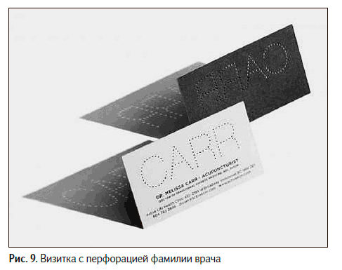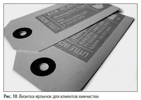 Этот же прием, но уже с перфорацией своего имени может использовать специалист по иглоукалыванию и рефлексотерапии (рис. 9). Боулинг-центру имеет смысл заказать себе визитки в виде кегли. Салону оптики подойдут визитные карточки с узнаваемым контуром оправы для очков. Сеть прачечных или химчисток только выиграет, если стилизует визитку под ярлычок, который обычно крепится к новой одежде (рис. 10). Какую идею может передать такая визитка клиентам химчистки? После нас ваша одежда будет выглядеть как новая, только что купленная в магазине. Разумеется, качество услуг при этом должно быть соответствующим. И прикладывать такую визитку нужно к каждому выполненному заказу.