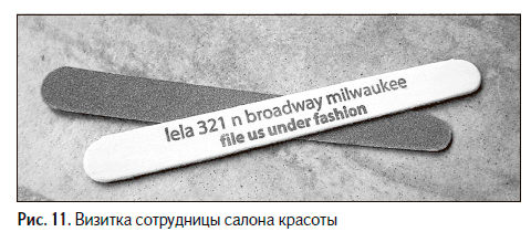 Выделиться парфюмерному бутику поможет визитка в виде полоски-пробника, которой мы привыкли пользоваться при «дегустации» аромата. А салону красоты никто не запрещает превратить в визитку, например, пилочку для ногтей (рис. 11).