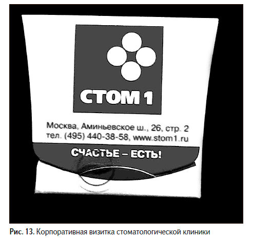 Стоматологической клинике наше агентство предложило выполнить визитку в виде сложенной картонной коробочки, напоминающей швейный набор, который обычно встречается в номерах мало-мальски приличных гостиниц (рис. 12).
