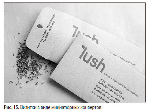 Следующий пример. Если вы имеете отношение к выращиванию цветов, озеленению, декорированию газонов, продаже зерна, то выполните визитки как миниатюрные конверты. Внутрь положите щепотку семян. Совместите вручение визиток и раздачу бесплатных образцов своей продукции (рис. 15).