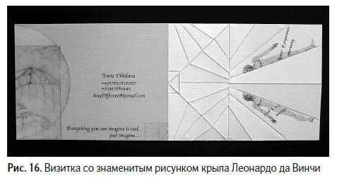 Одна моя знакомая, выпускница авиационного института, для победы в тендере ЮНЕСКО на получение крупного международного заказа придумала и напечатала визитки, в которых неожиданным образом отразилось вечное стремление человечества к полету. Такую визитку люди начинали внимательно рассматривать помимо их воли. Её не хотелось выпускать из рук (рис. 16). Внизу визитки рядом со знаменитым рисунком крыла Леонардо да Винчи приводилось высказывание Пабло Пикассо: «Everything you can imagine is real (Все, что можно себе представить, – реально)».