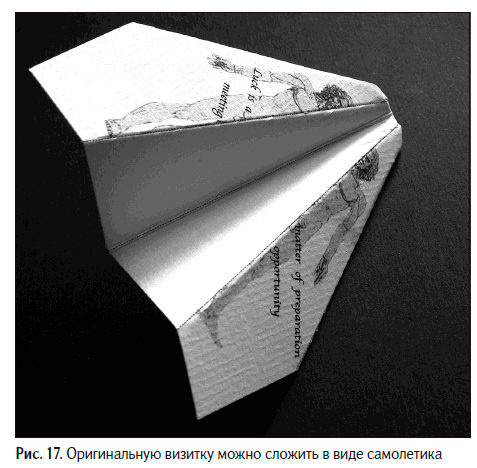 Яркое впечатление при вручении визитки усиливалось тем, что ее правую половину после некоторых раздумий можно было превратить в знакомое каждому ребенку оригами. Естественно, связанное с полетом (рис. 17). После чего забыть об авиационном прошлом хозяйки визитки, как и о ней самой, было уже невозможно.