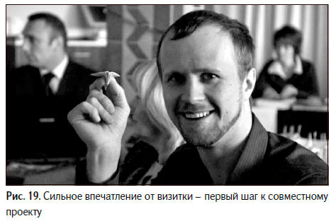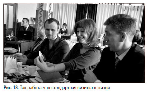 После одного из семинаров ко мне подошел мужчина и протянул свою визитку в виде тончайшей ажурной металлической пластины. Он уже несколько лет занимался производством бизнес-сувениров из металла, но мысль сделать себе необычную визитку пришла ему в голову только после знакомства с моей книгой. Смотрелся такой сувенир эффектно, нестандартно и представительно. Эту металлическую визитку я стал демонстрировать в качестве наглядного пособия на своих тренингах. Однажды во время выступления в Бизнес-инкубаторе Высшей школы экономики визитка «пошла» гулять по рядам и ко мне уже не вернулась. Считаю, что именно такой эффект и должна вызывать хорошая визитная карточка – непреодолимое желание оставить ее себе на память.