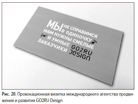 Еще пара примеров. Дизайнер сам разработал свою визитку. Вложил в нее душу. Она яркая и броская. На ней он написал такие слова: «Сгораю от нетерпения показать вам другие мои работы на www.portfolio.ru». Или так. На обратной стороне визитной карточки наших партнеров можно прочитать фразу, которая определяет наиболее желанный тип потенциальных клиентов и одновременно бросает им вызов (рис. 20).